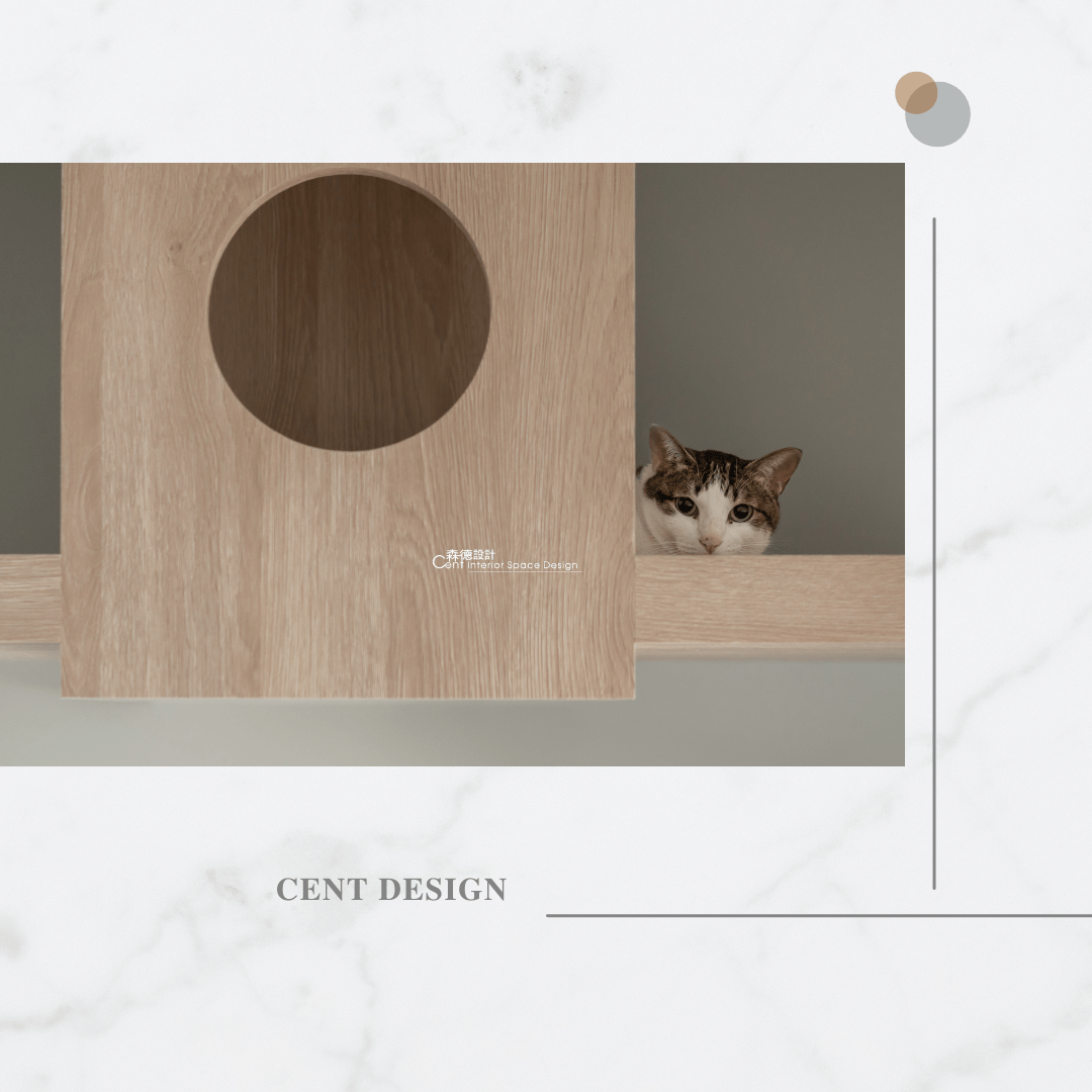 例如:從客廳的電視牆面、電視櫃體、收納櫃延伸層板或是開孔,既可同時滿足屋主與貓主子的需求,也能增添空間生活樂趣,即便不使用也是個特意的設計。